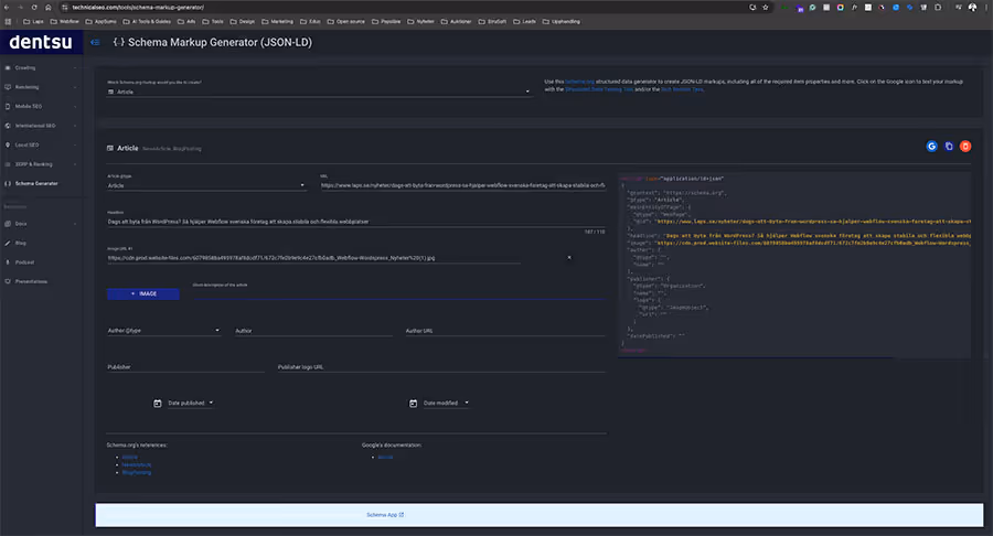 • Anpassade fält: Lägg till specifika datafält för att bättre strukturera ditt innehåll med hjälp av https://technicalseo.com/tools/schema-markup-generator/